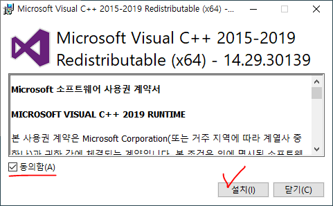 OpenSSL 설치를 중단하고 다운로드된 VC_redist.x64.exe를 실행한다.