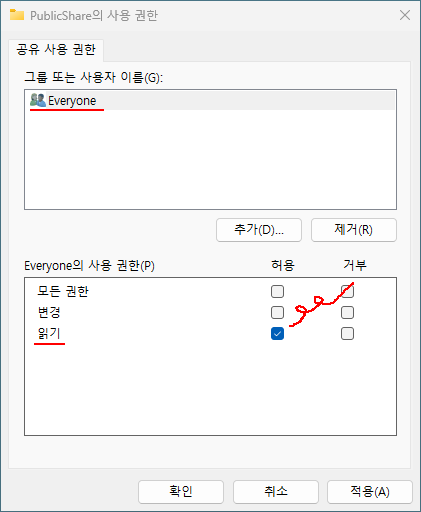 4. Everyone 그룹에서 읽기 권한 제거