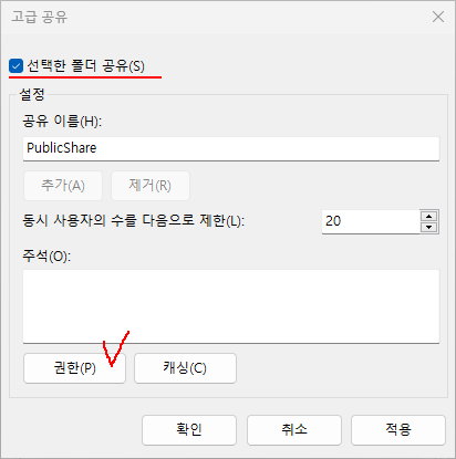 3. 선택한 폴더 공유(S)를 체크하고 권한 클릭