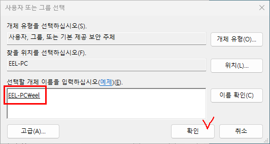 6. 컴퓨터이름\사용자를 입력하고 확인