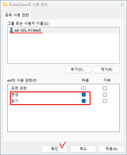 7. 읽기와 변경 권한만 부여하고 확인