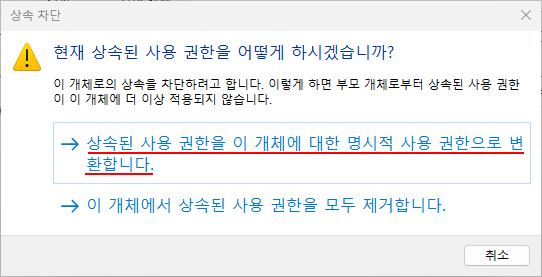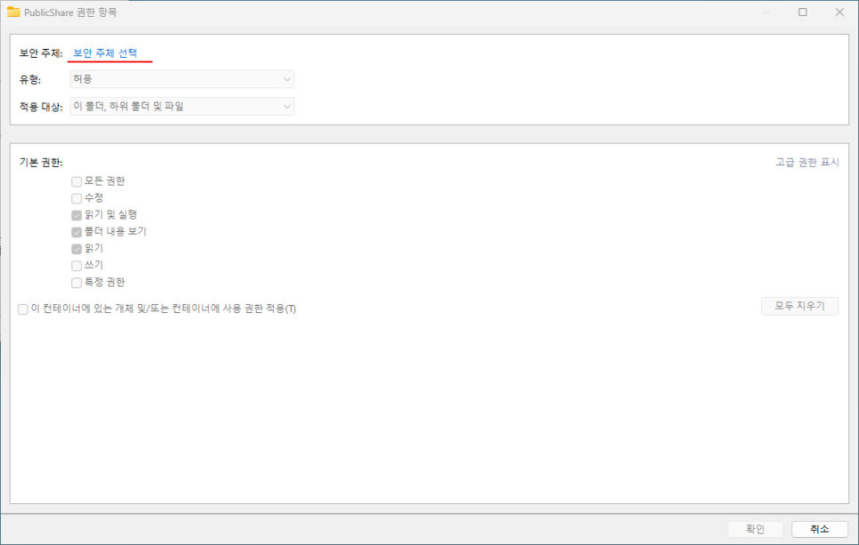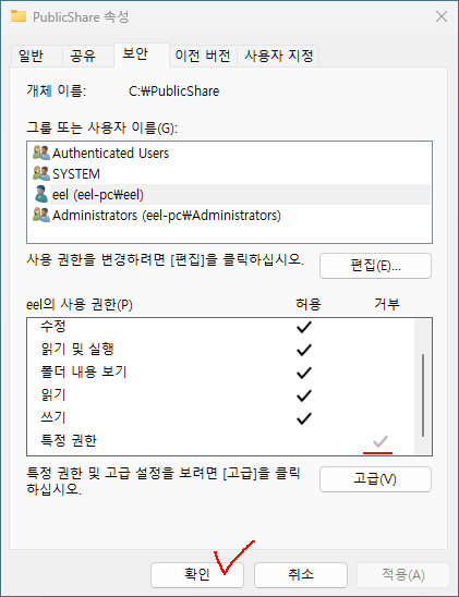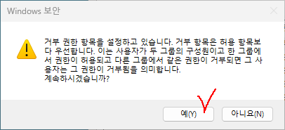 17. 특정 권한에 거부가 체크됨, 확인으로 종료