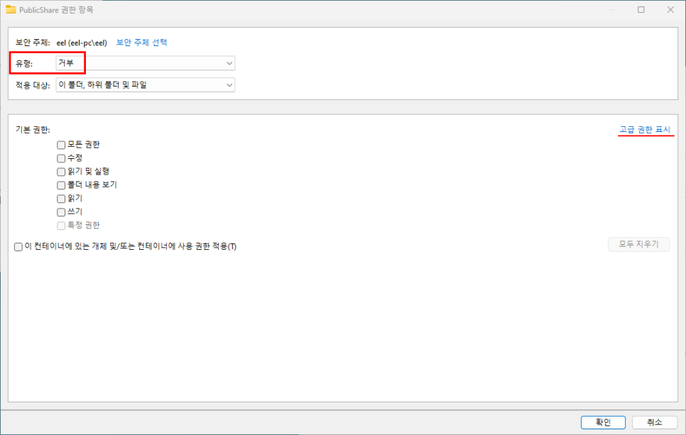 13. 거부 유형을 선택하고 고급 권한 표시를 클릭