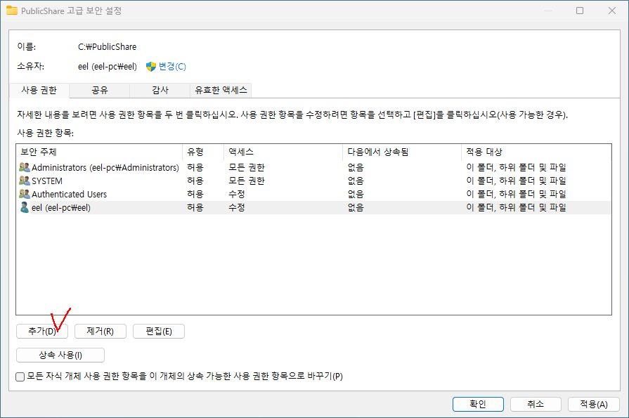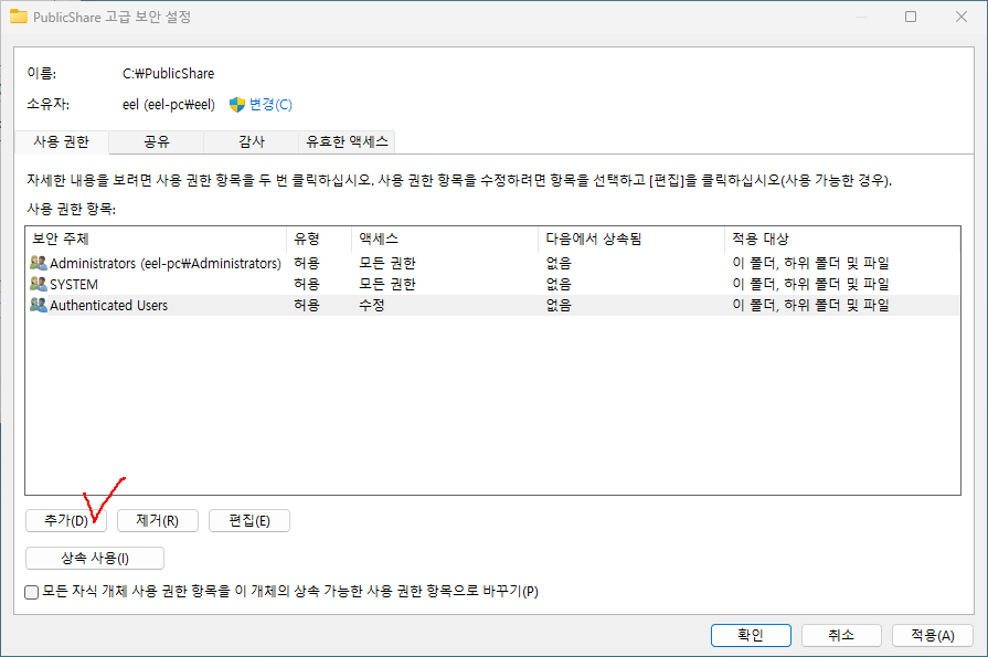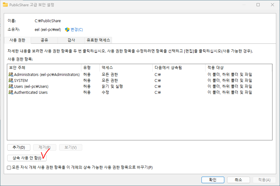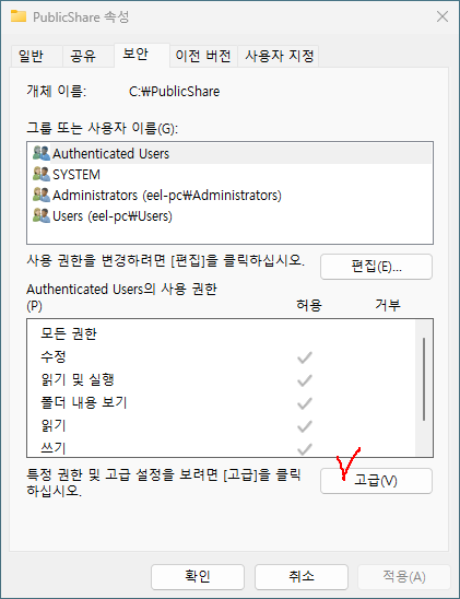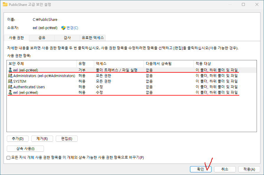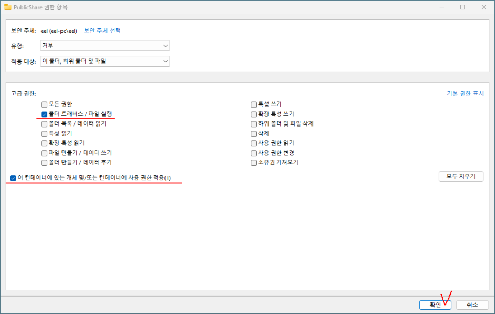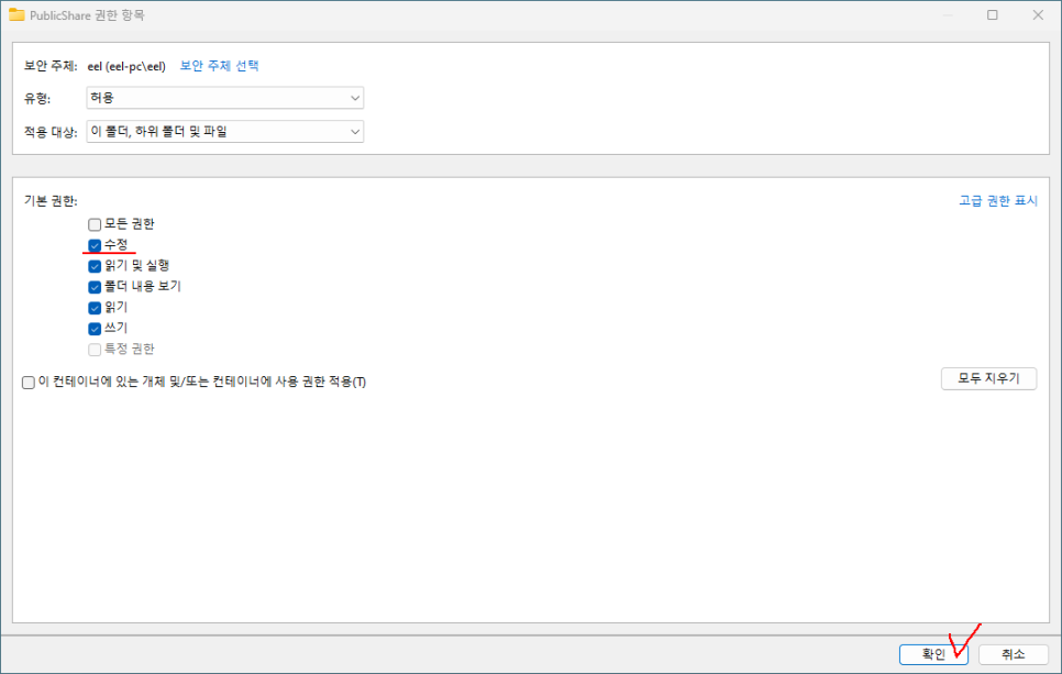 15. 설정한 권한을 점검하고 확인을 클릭하여 적용