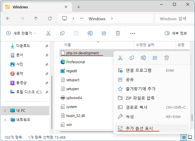 7. php.ini-development 파일을 오른 클릭하여 추가 옵션 표시로 간다.