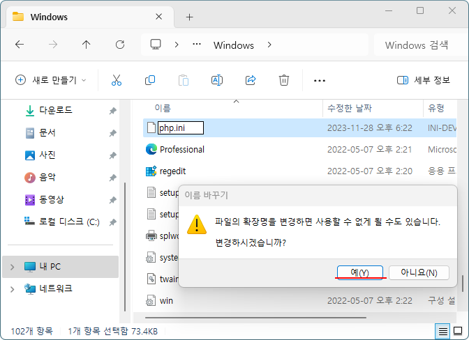 11. 확장명 변경 확인 창이 뜬다면 이를 예(Y)를 선택한다.