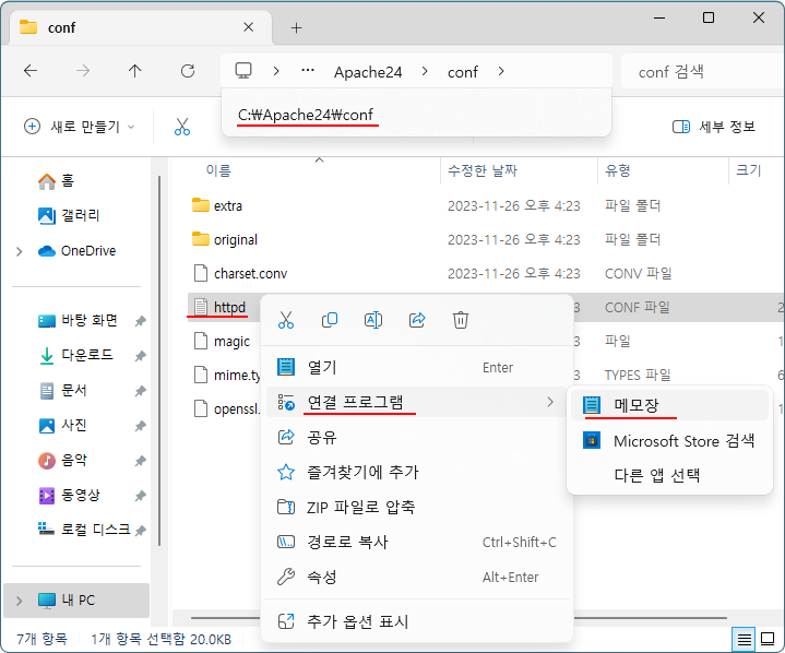 3. C:\Apache24\conf\httpd.conf 파일을 메모장으로 연다.