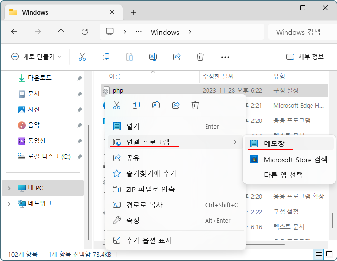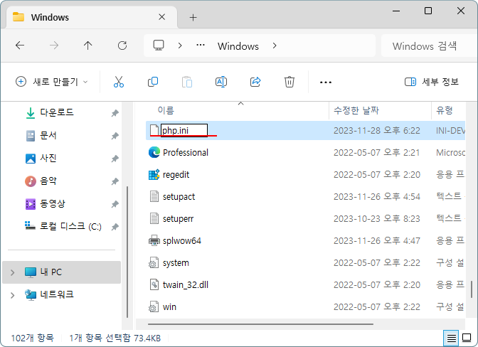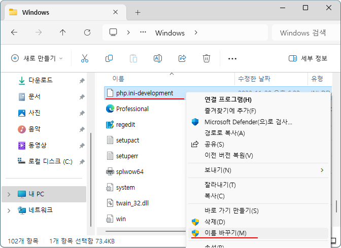 6. C:\Winodows 폴더 안에 php.ini-development 파일을 붙여 넣는다.