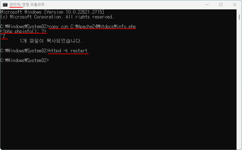 ② copy con C:\Apache24\htdocs\info.php 입력하고 엔터