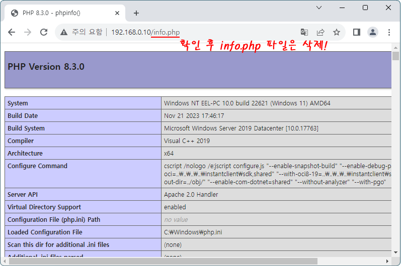 LoadModule php_module C:/php-8.3.0-Win32-vs16-x64/php8apache2_4.dll *186줄에 추가