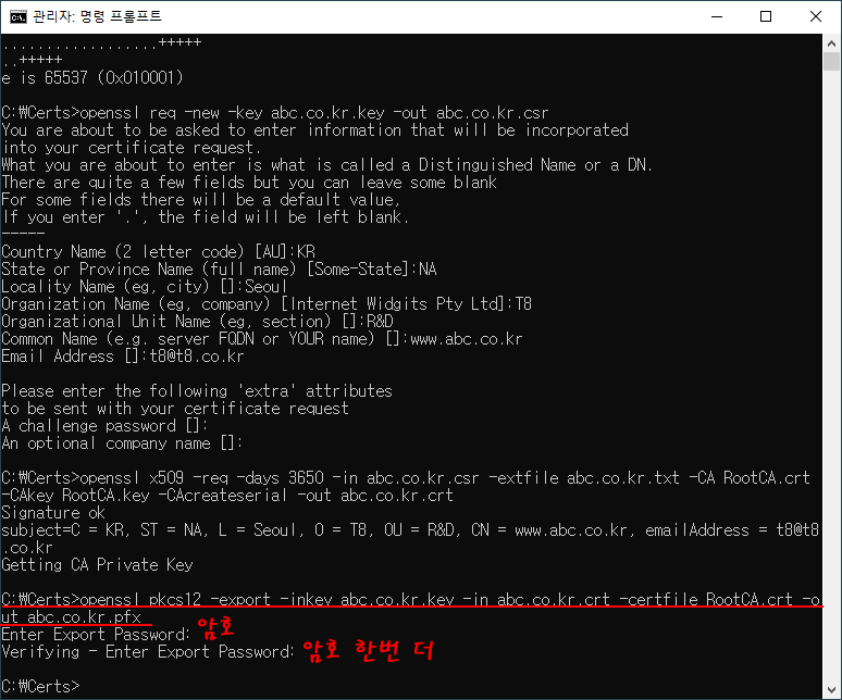 openssl pkcs12 -export -inkey abc.co.kr.key -in abc.co.kr.crt -certfile RootCA.crt -out abc.co.kr.pfx