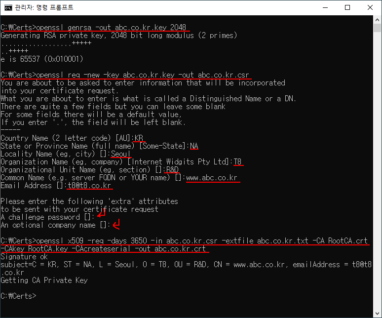 openssl req -new -key abc.co.kr.key -out abc.co.kr.csr
