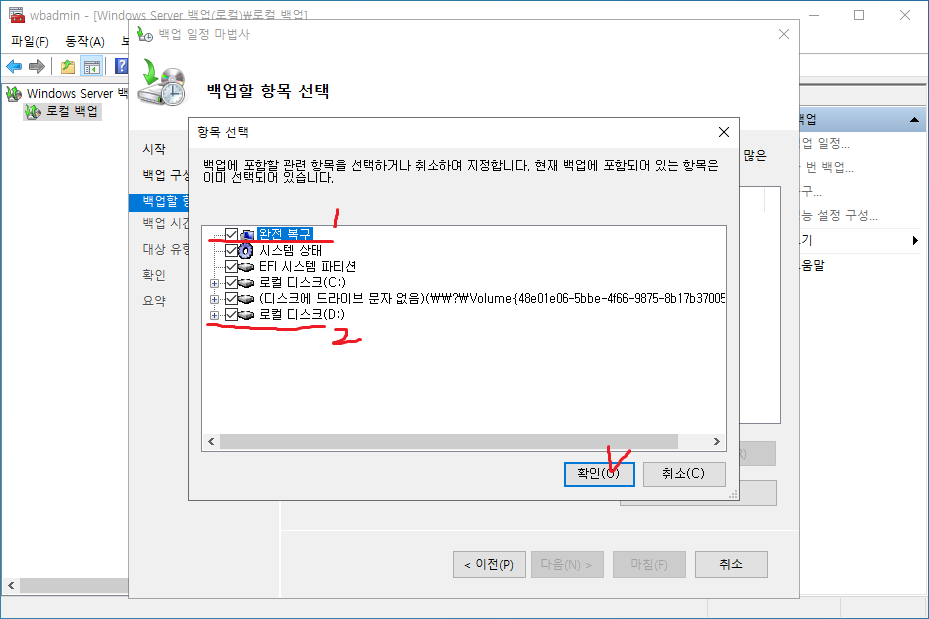 7. 완전 복구를 선택한 후 백업에 추가할 로컬 드라이브가 있으면 선택한다. *예: 로컬 디스크(D:)