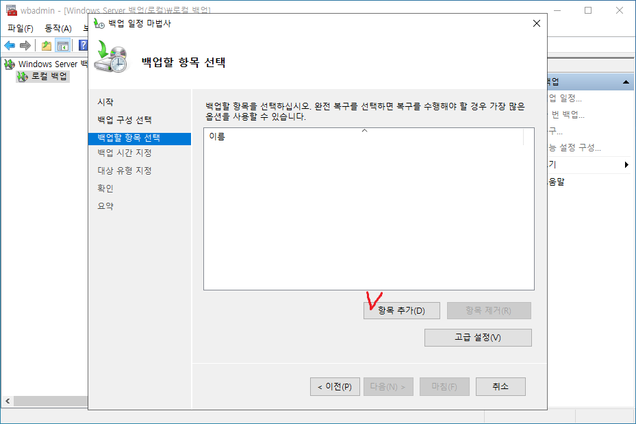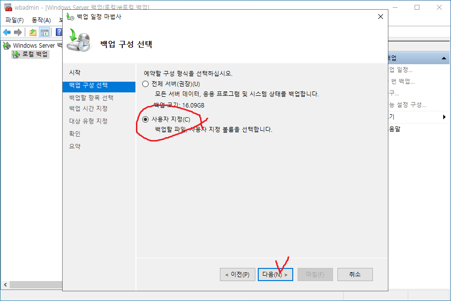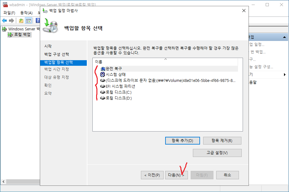 8. 백업 세트에 들어 갈 항목을 확인한다.