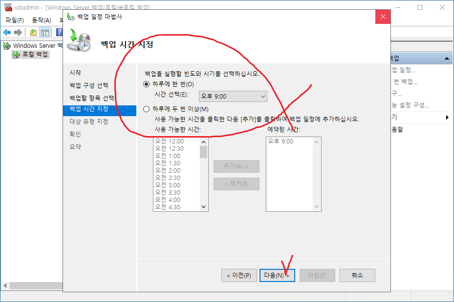 9. 일정을 알아서 선택한다. *처음에 하는 백업은 전체이며 이후부터는 증분이다.(하루에 여러 번도 괜찮음)