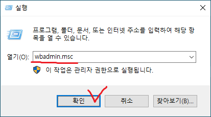 2. 실행에 wbadmin.msc를 입력하여 GUI를 연다.