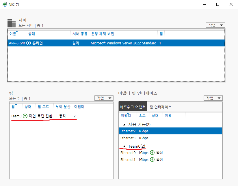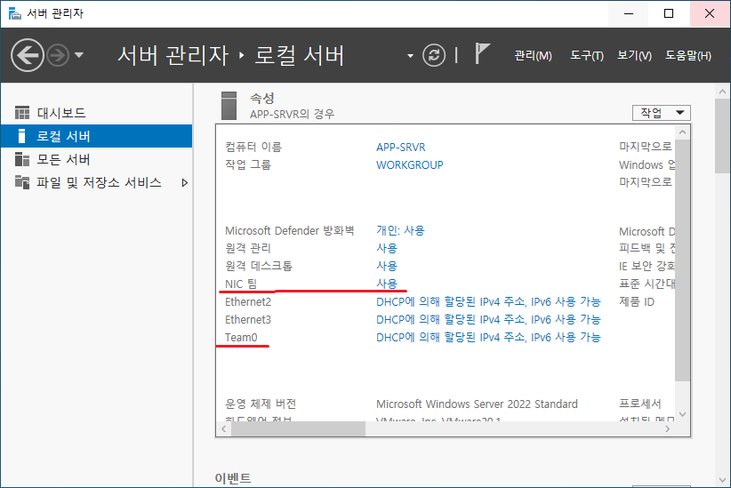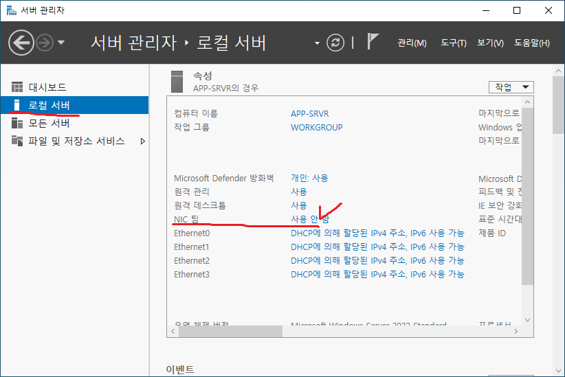 1. 서버 관리자의 로컬 서버에 NIC 팀이 사용 안 함으로 돼 있는 걸 클릭한다.