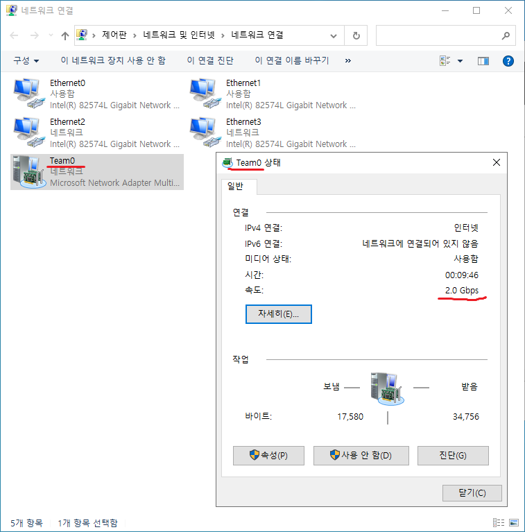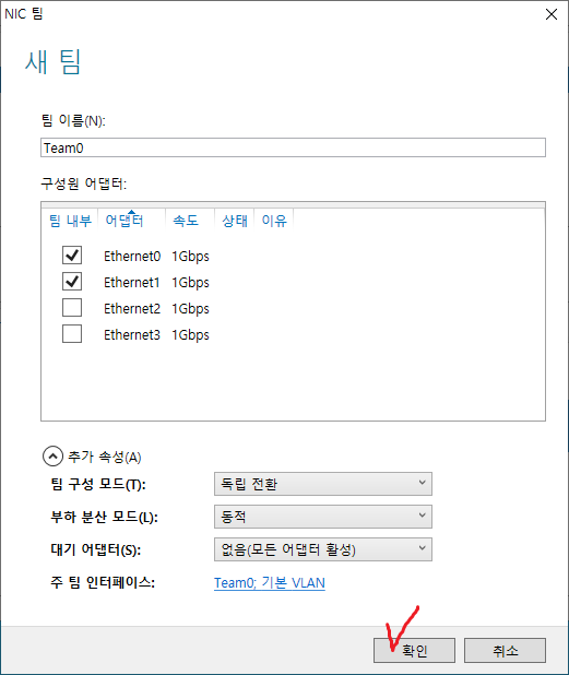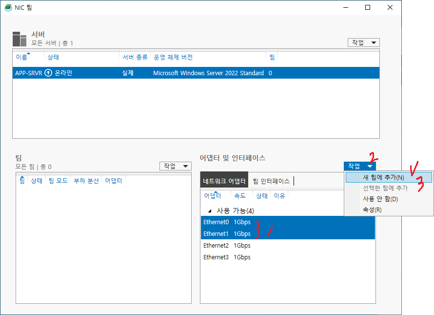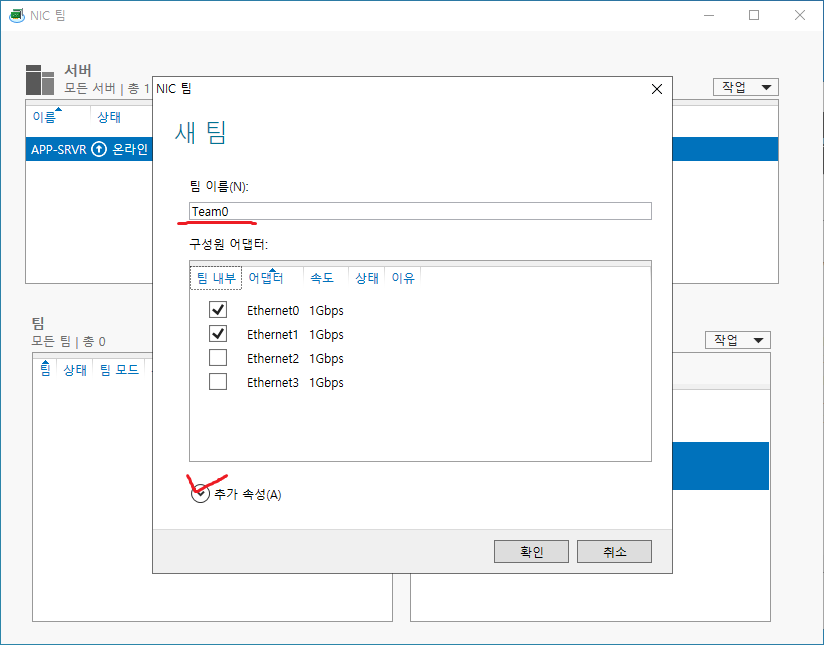 2. 팀을 구성할 네트워크 어댑터를 선택하고 새 팀에 추가한다.