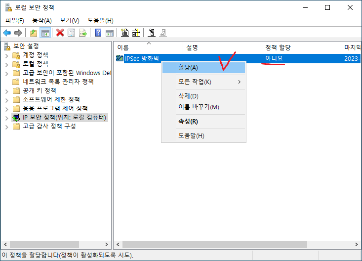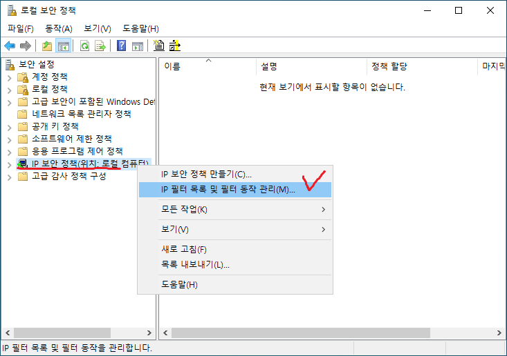 2. IP 보안 정책을 우클릭 후 IP 필터 목록 및 필터 동작 관리를 선택한다.
