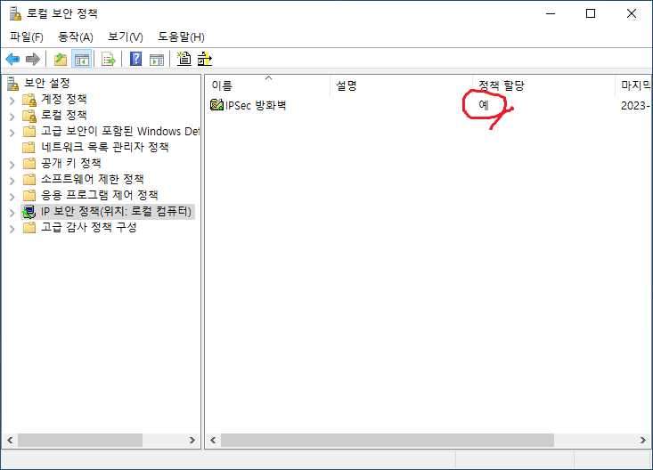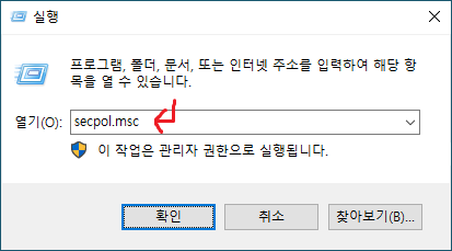 1. 실행에 secpol.msc를 입력하여 로컬 보안 정책 창을 연다.