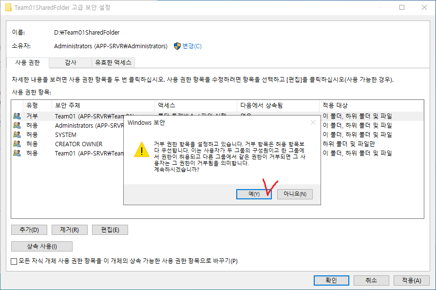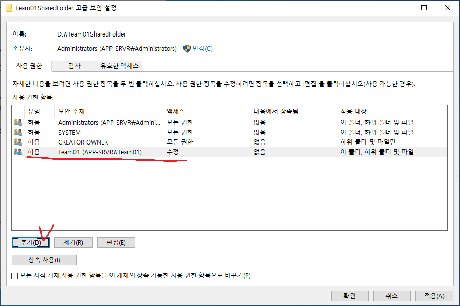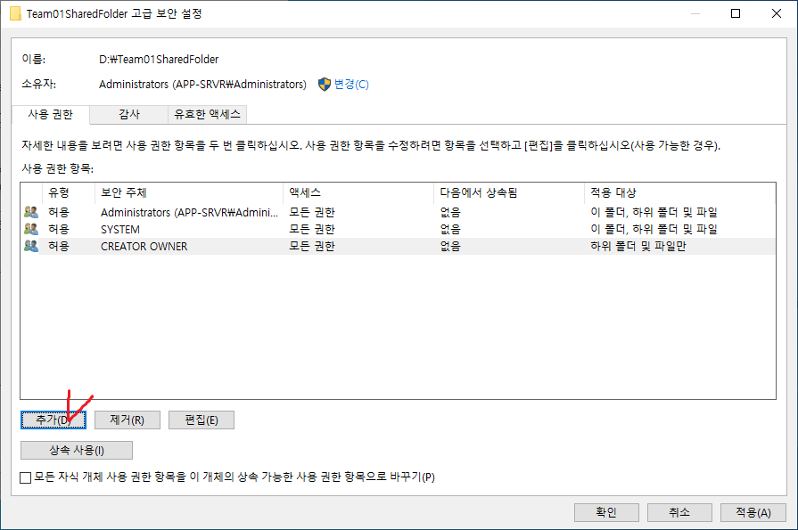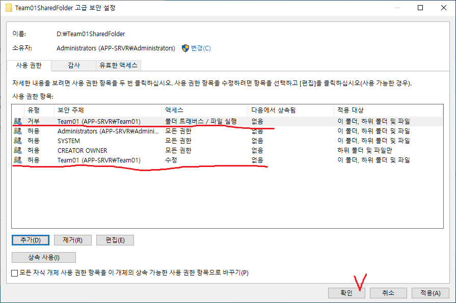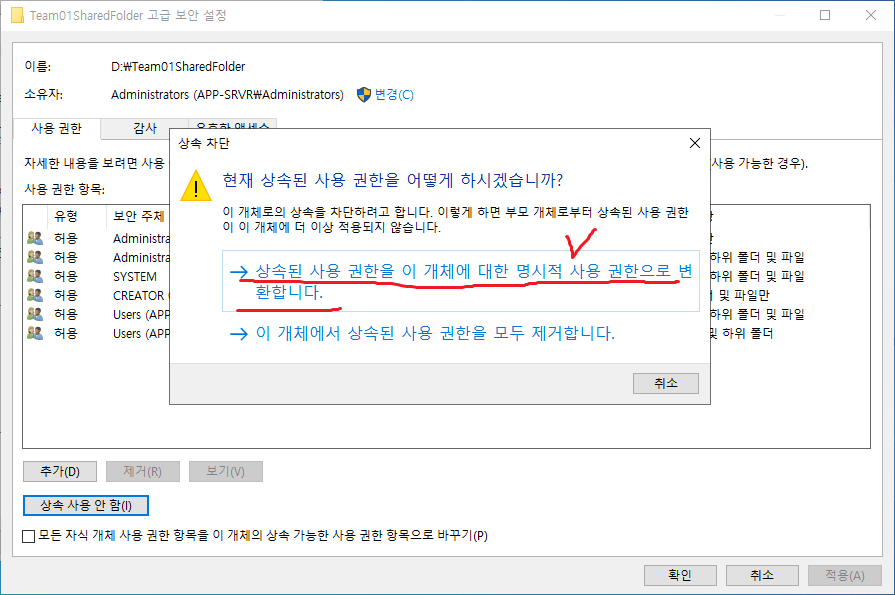 9. 현재 선택된 폴더를 기준으로 위로부터의 상속을 끊는다.