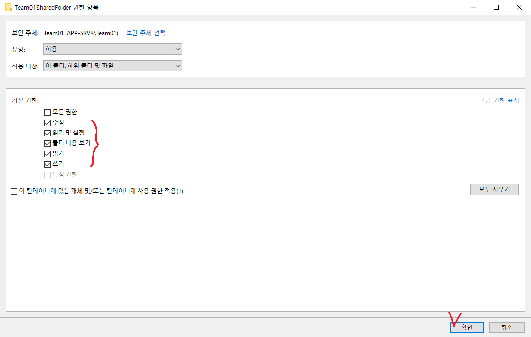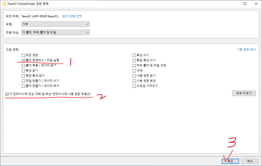 24. 폴더 트래버스/파일 실행, 이 컨테이너에 있는 ~ 적용을 선택하고 확인한다.