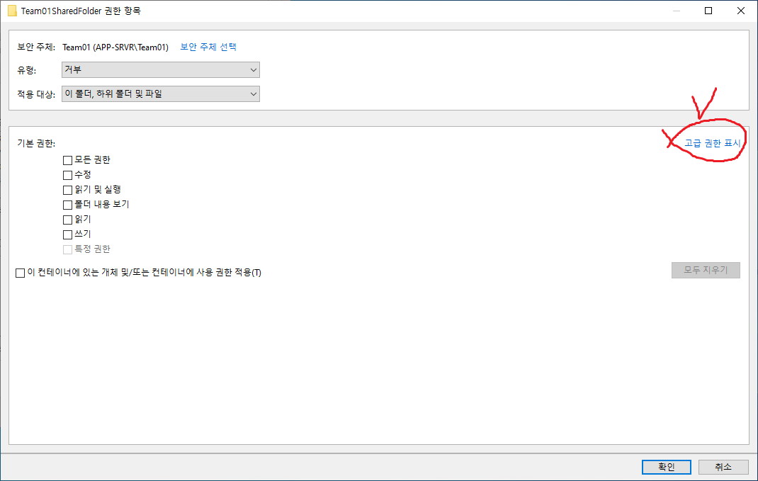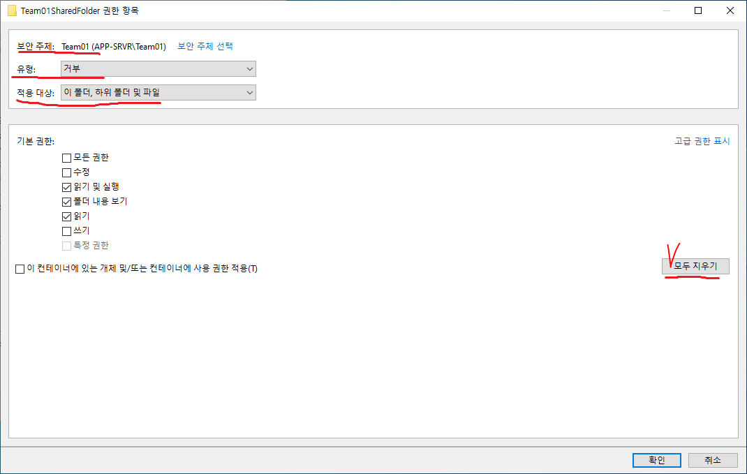 22. 거부를 선택하고 기본 권한을 모두 지운다.