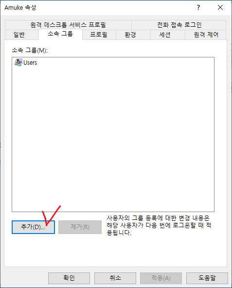 42. 사용자 속성에서 소속 그룹 탭으로 이동하여 추가를 클릭한다.