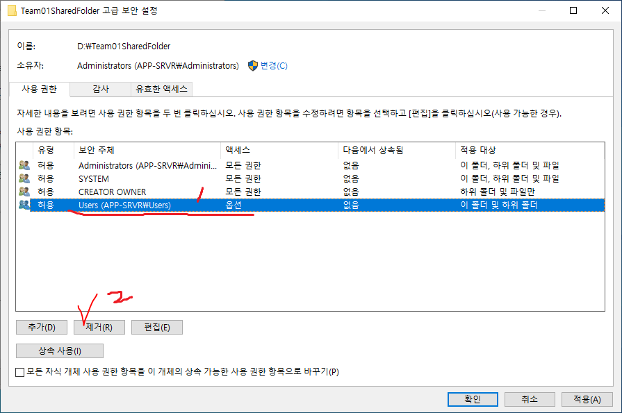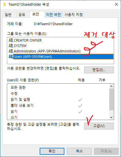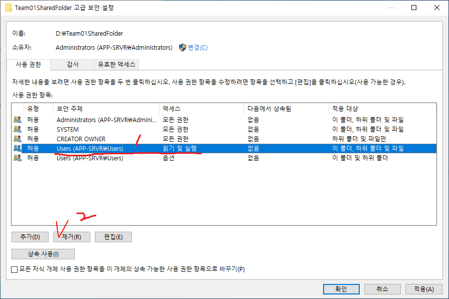 10. Users 그룹의 읽기 및 실행을 제거한다.