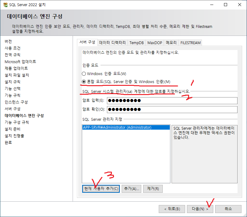 17. 혼합 모드로 하고 sa의 암호를 설정한다. *현재 사용자를 SQL Server 관리자로 추가