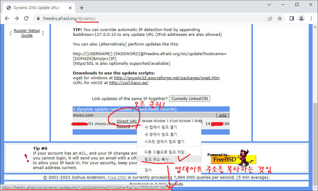 8. 등록된 DDNS 주소의 Direct URL을 오른 클릭하여 링크 주소를 복사한다.