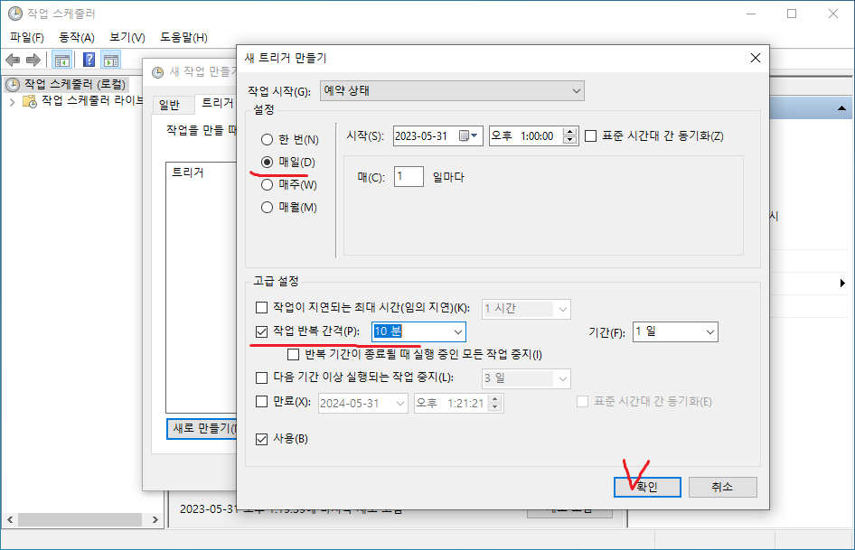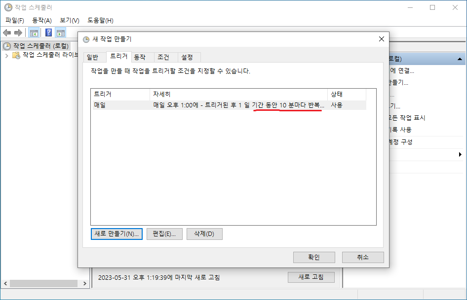 13. 작업 반복 시간을 설정한다. *아래 예는 10분마다 실행