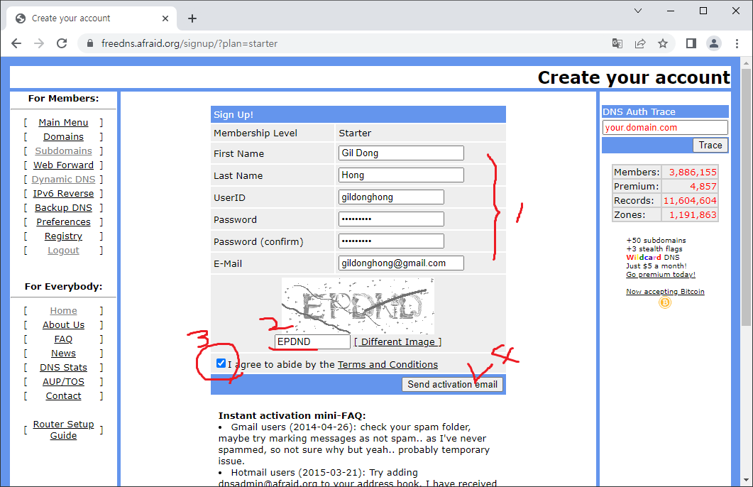 (DDNS를 써야 할 서버가 10대이면, 이메일주소 10개로, 10개 계정을 만들어서 각각에 1개씩만 설정)