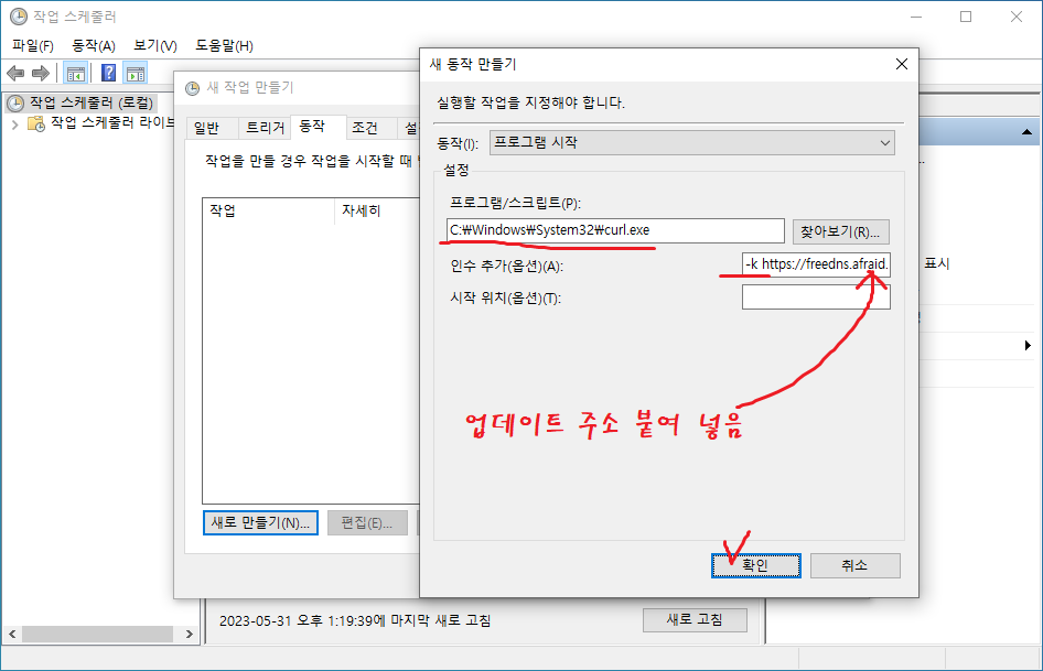 18. 인수 추가(옵션)에 -k를 추가한 후 클립보드에 들어 있는 업데이트 주소를 붙여 넣기한다.