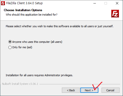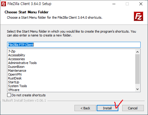 10. 시작 메뉴에 FileZilla FTP Client 폴더를 만들도록 한다.