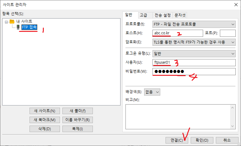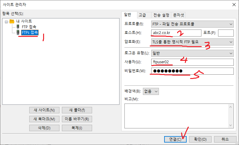 *FTPs 접속은 대부분 TLS를 통한 명시적 FTP 필요 옵션이다.