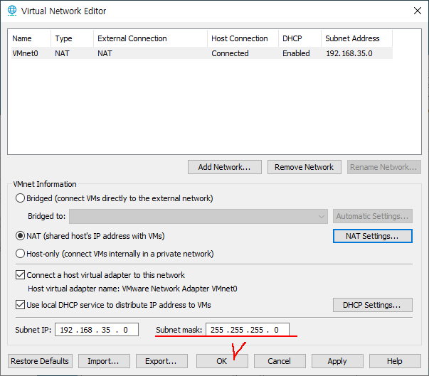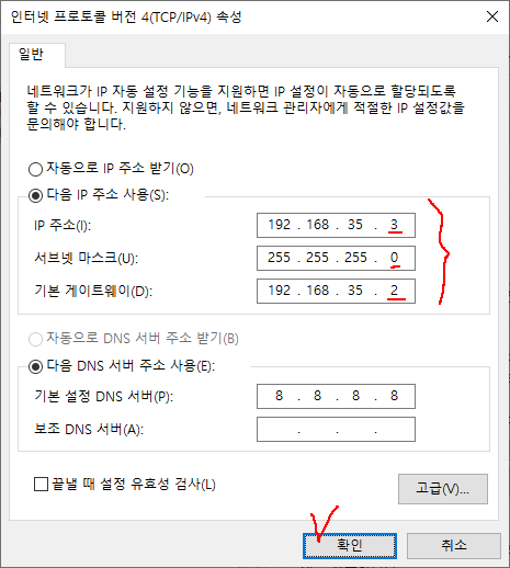 9. Gateway IP를 알아 두고 설정을 마무리한다. *VMWare를 실행하는 호스트의 가상 어댑터 주소이다.
