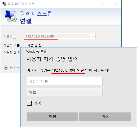 *VMWare를 실행하는 호스트에서 바인딩한 포트로 가상머신의 원격 데스크톱에 접속해본다.