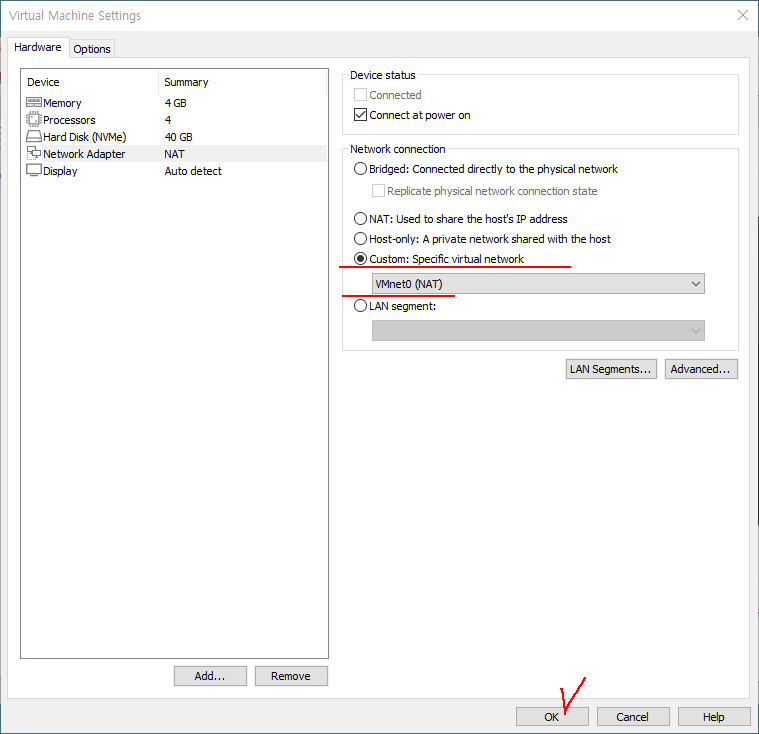 12. Custom으로 바꾸고 NAT가 구성된 스위치를 선택한다.
