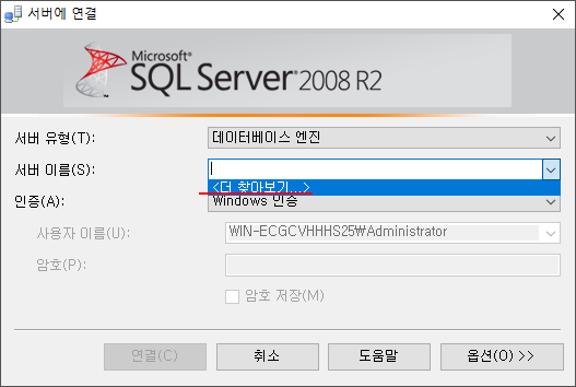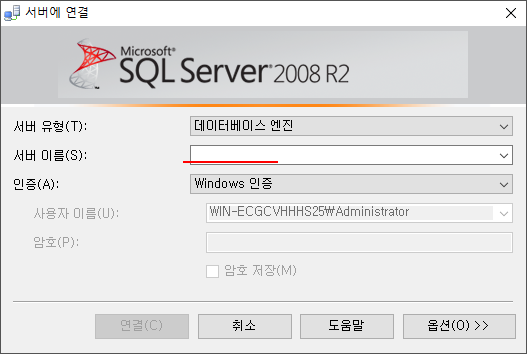 이 때 접속시 서버 유형(T)을 데이터베이스 엔진으로 한다.