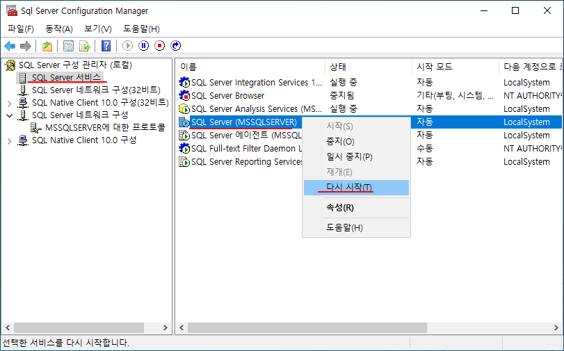 포트를 바꿨으면 SQL Server 서비스를 재시작한다.