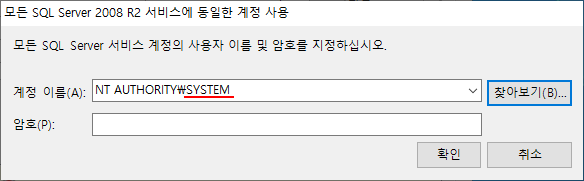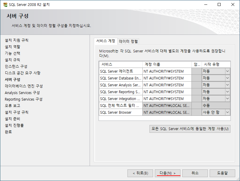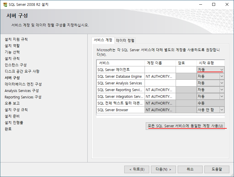 SQL Server 서비스와 관련된 계정, 시작 유형 등을 한번 훌터 본다.
