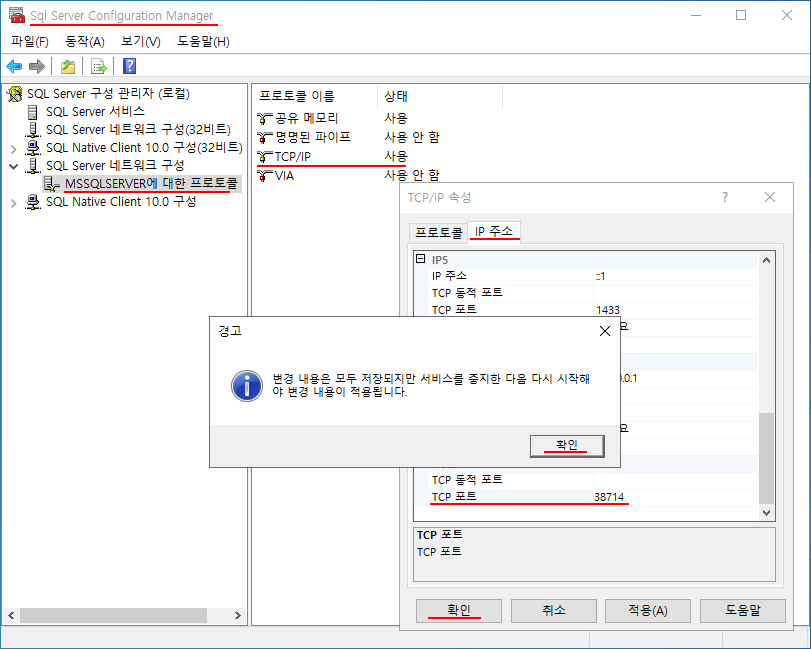 SQL Server 구성관리자를 실행하여서 포트번호를 꼭 변경한다.