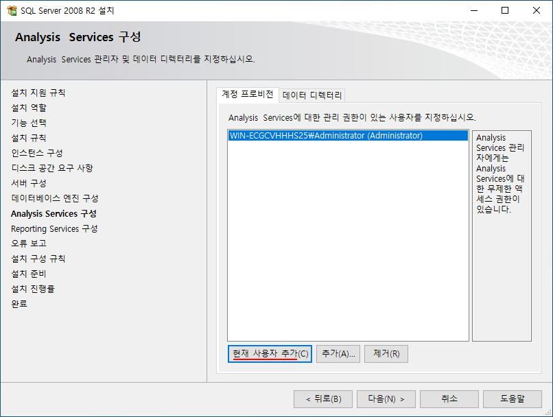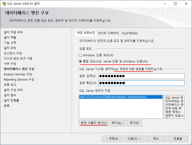 현재 사용자를 추가하여 SQL Server 관리자로 정한다.