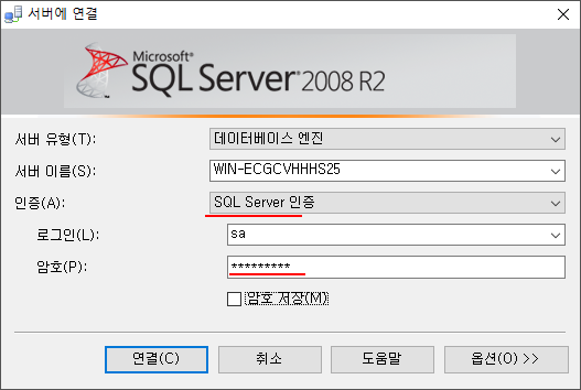 처음이라 sa 계정뿐일테니 이를 입력한다.