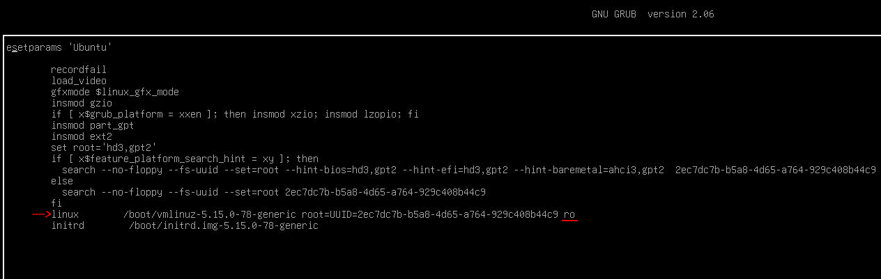 GRUB 메뉴의 Ubuntu에서 e 키를 누른다.