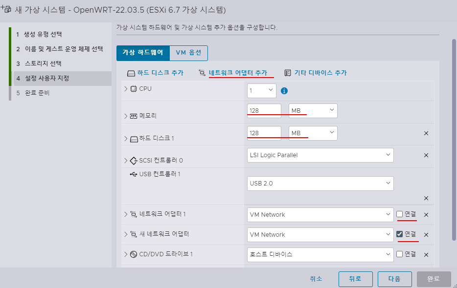 3. 메모리와 하드 디스크 용량을 적당히 설정하고 네트워크 어댑터를 추가 후 기존 것의 체크는 지운다.