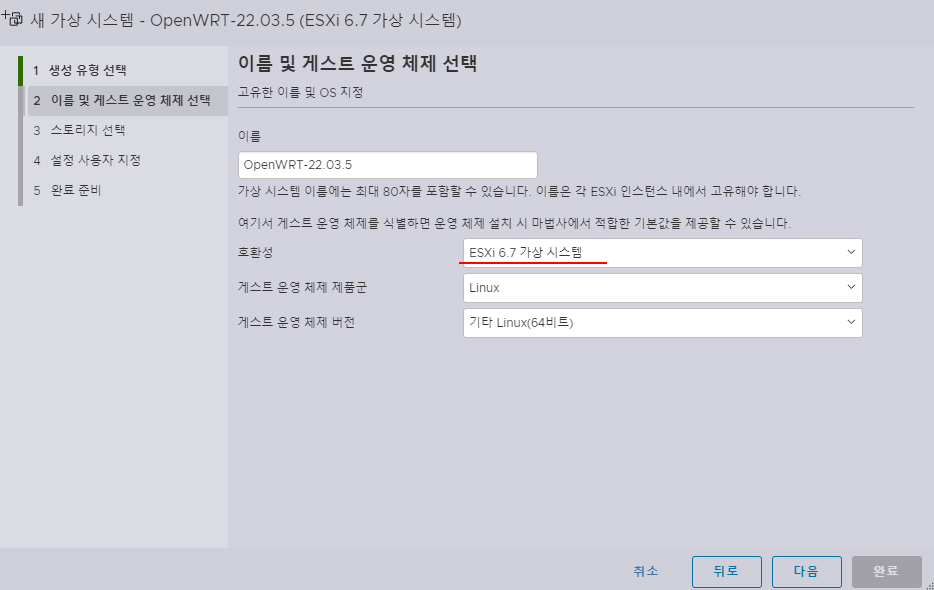 1. 이름을 짓고 호환성은 낮은 버전 ESXi에서도 올릴 수 있도록 ESXi 6.7 가상 시스템을 선택한다.
