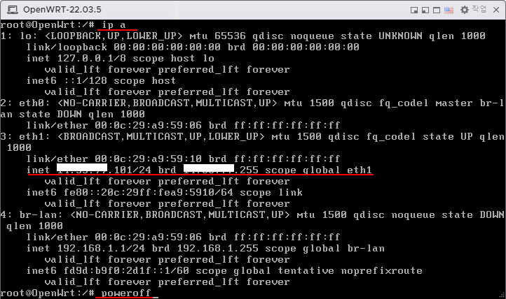 20. ip a 를 입력하여 eth1에 아이피가 받아졌는지 확인하고 poweroff 를 입력해서 종료한다.