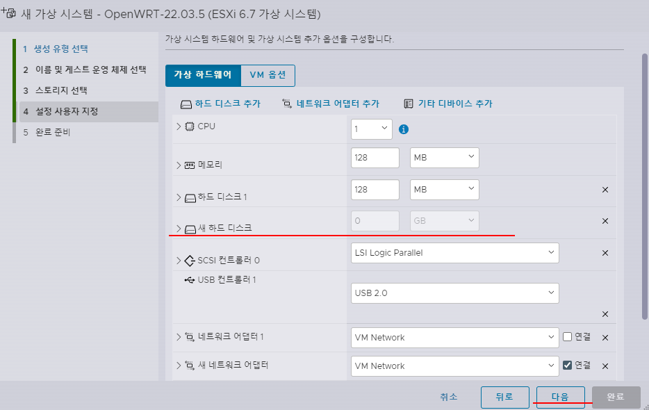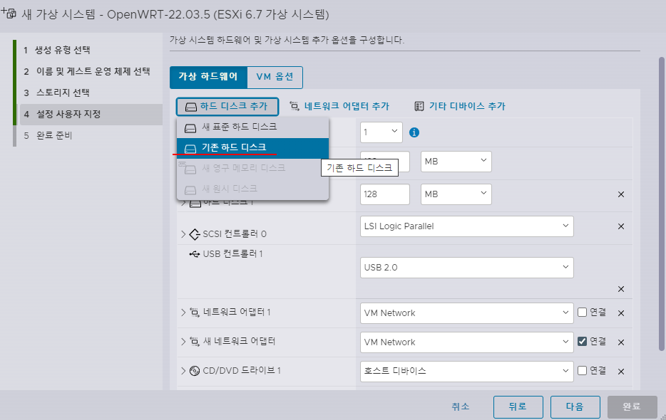 IMG에서 변환한 VMDK 파일로 ESXi 8에서 가상머신을 생성하는 과정이다.